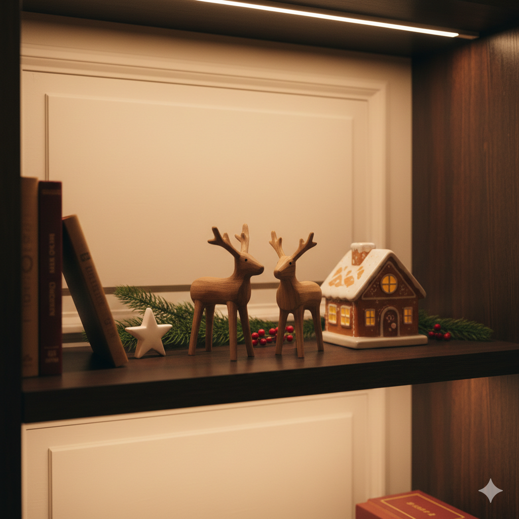 A veces, un solo objeto bien colocado dice más que un salón lleno de adornos. Coloca pequeñas figuras de madera o cerámica, como renos minimalistas o casitas de jengibre de diseño nórdico, en estanterías o mesas auxiliares. Estos «descubrimientos» visuales deleitan al huésped de forma inesperada.