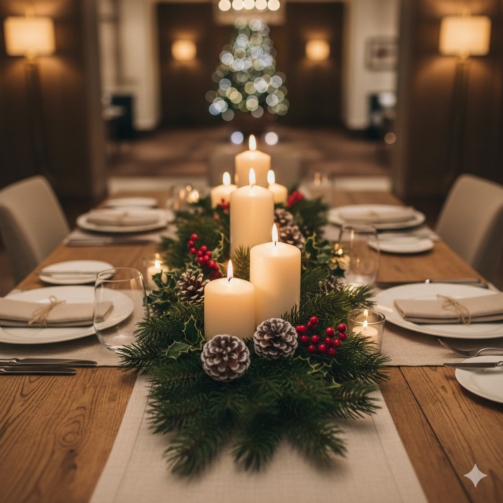 1. Centros de Mesa con la Esencia de la Naturaleza Olvida los adornos recargados. Opta por la belleza simple de la naturaleza. Crea centros de mesa con ramas de pino fresco, piñas, algunas bayas rojas vibrantes y velas blancas de distintos tamaños. Estos elementos, combinados con una base neutra, aportan calidez y un aroma sutil a tu lobby o restaurante, creando una experiencia sensorial sin saturar el espacio.