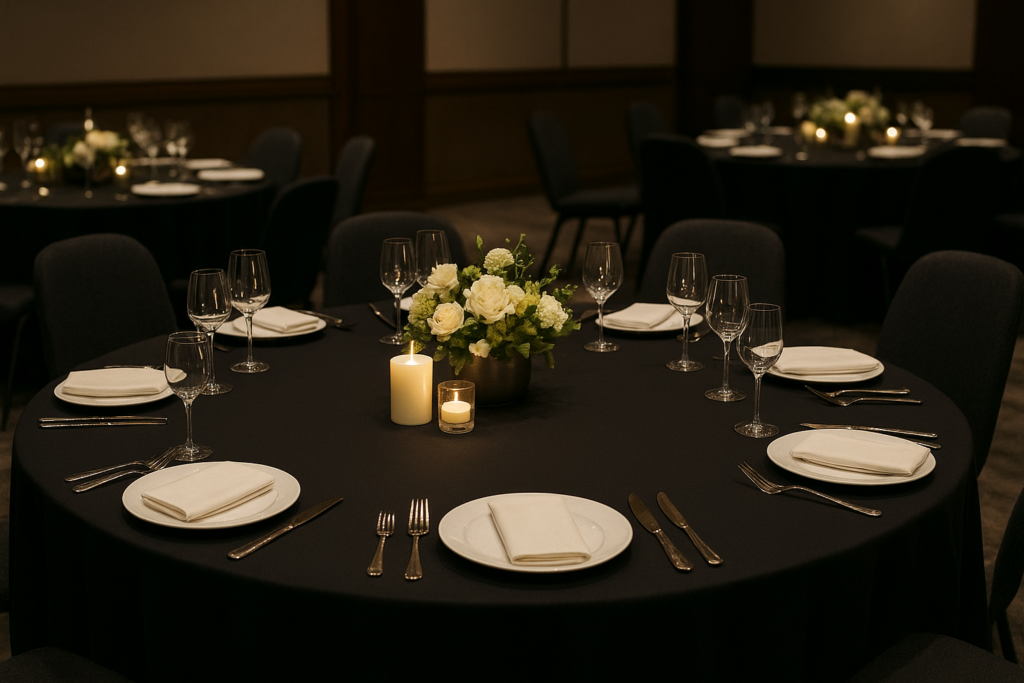 También es importante tener en cuenta el tipo de evento. Para celebraciones formales o galas, los tejidos lisos en tonos neutros como blanco, negro o gris aportan elegancia y sobriedad. En cambio, para eventos temáticos, corporativos o de empresa, los manteles personalizados en los colores corporativos ayudan a reforzar la identidad visual de la marca y a crear una experiencia coherente para los asistentes.